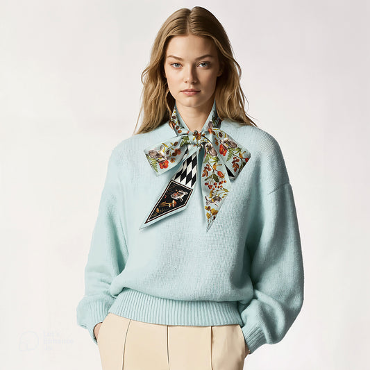 Premium 100% Mulberry Silk Skinny Scarf - Rabbit Forest Light Blue Pattern