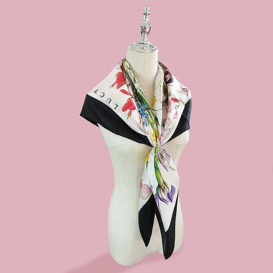Premium 100% Mulberry Silk Square Scarf - Flower Black Border Pattern 35"x35"